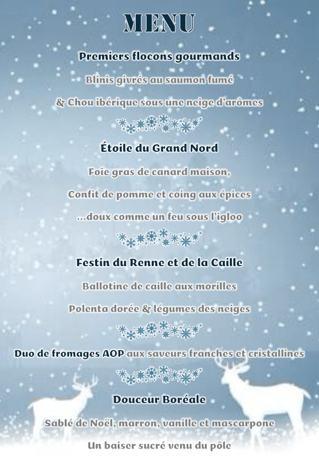 La magie d’un Noël Polaire s’installe doucement dans notre établissement… À l’approche de la fin d’année, nous préparons un moment chaleureux où flocons, lumières glacées et douceur hivernale seront au rendez-vous.
